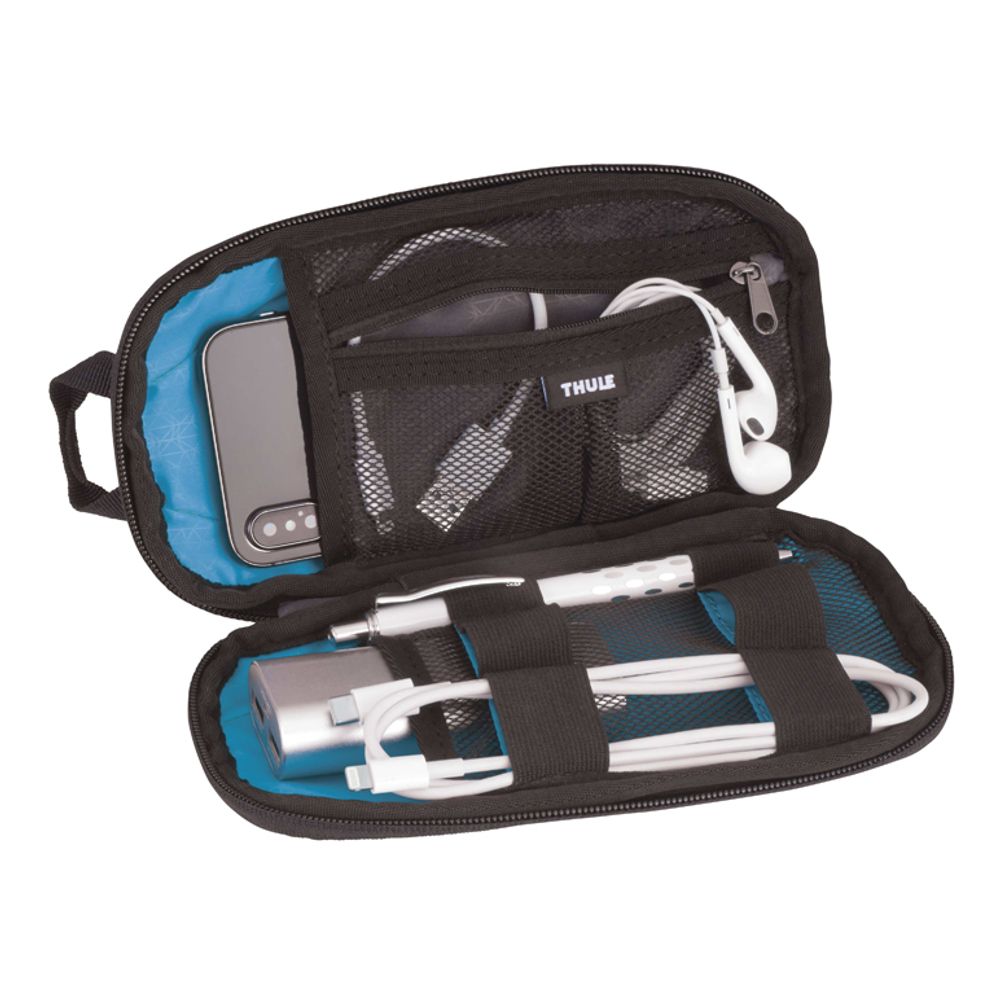 Organize cables, adapters, earbuds and small personal accessories in a variety of secure pockets and elastic loops